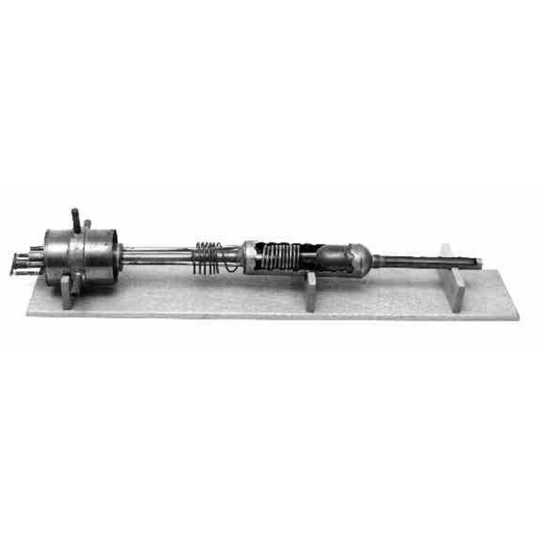 Alongside this is a copy of a glass torus made in the laboratory for Peter Thonemann in 1947, with his original sketch (which shows that it was delivered two days after the sketch was made). The original glassblower was Douglas Saxton. This was almost certainly the first torus made for investigations intended to lead to thermonuclear fusion, which Thonemann initiated in the laboratory, before going on to large scale work at Harwell. Work based on his original idea is still in progress at JET and elsewhere. The first torus was lent out and unfortunately, subsequently lost; the one on display is a copy made by Steve Giles.