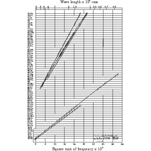 Another highlight is the original Moseley diagram (image in gallery below) of the square root of the frequency of the K and L lines in the X-ray spectrum of the elements, against the atomic number Z. This appears to have been drawn by his own hand, and has an endorsement by Townsend. It has pride of place outside the Martin Wood Lecture Theatre. See also The story of Moseley and X-rays which will tell you what the endorsement by Townsend at the bottom says.