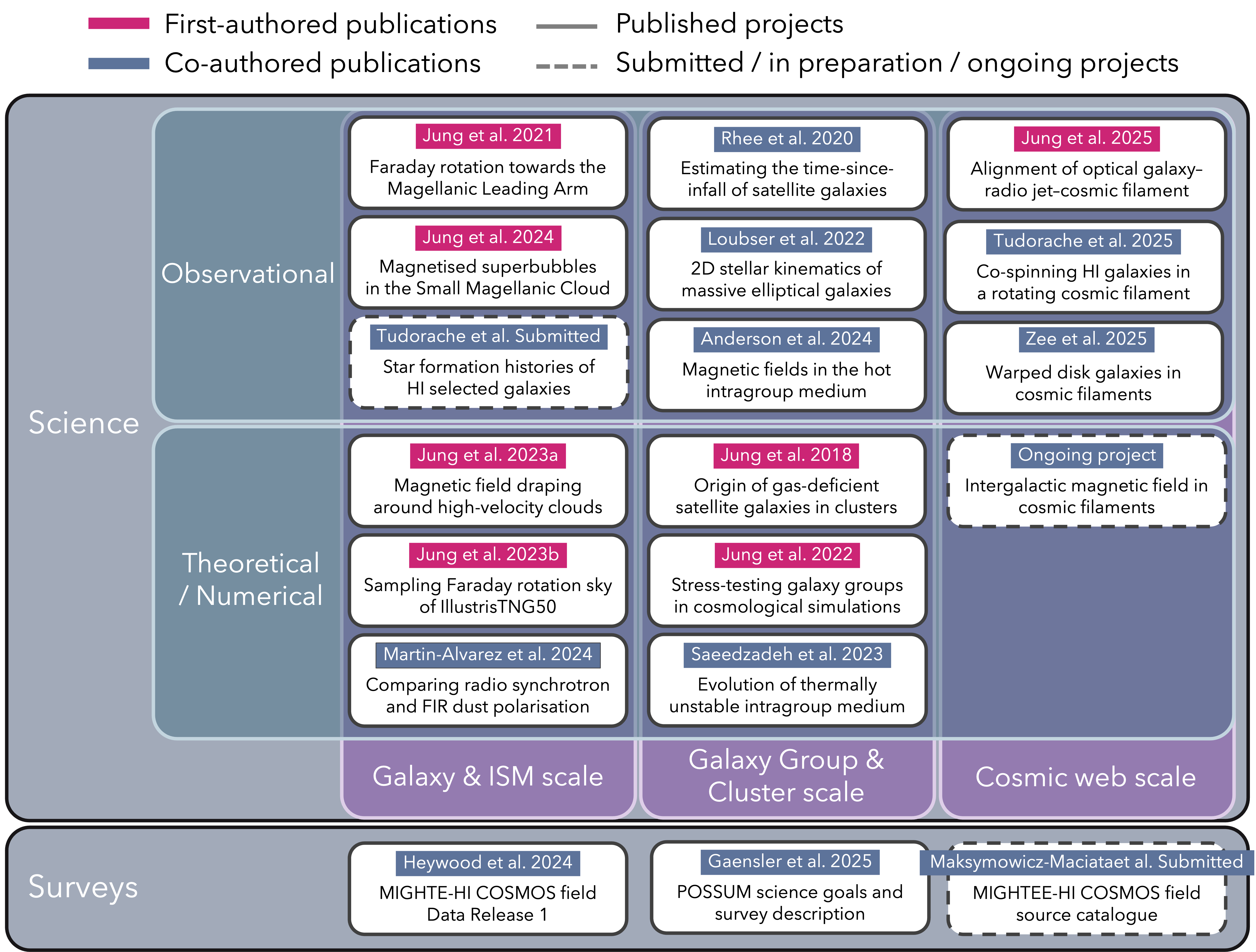 For my research, I take both observational and numerical approaches to draw a coherent picture of galaxies in the Universe. On the observational side, I use radio wavelength observations such as the MeerKAT International GHz Tiered Extragalactic Exploration (MIGHTEE) and Polarisation Sky Survey of the Universe's Magnetism (POSSUM). On the simulations side, my scope of interest ranges from small-scale idealized simulations to large-volume cosmological simulations.