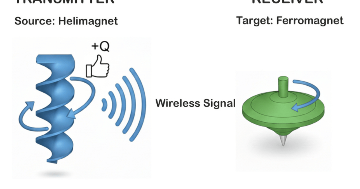 A groundbreaking study led by Shilei Zhang, Thorsten Hesjedal and Gerrit van der Laan (ShanghaiTech University, Oxford and Diamond), published in Nature Physics, explores how certain types of magnetic materials can send and receive signals wirelessly. When a special type of magnet called a "helimagnet," which has a unique spiral-like arrangement of its magnetic moments, is excited by microwaves, it can send out signals that make another nearby ordinary ferromagnet move in sync, resembling an interlocking gear mechanism.